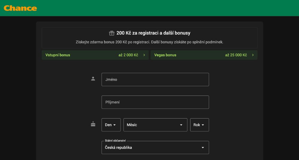 Založit si v této výherní platformě hráčský účet můžete rychleji než řeknete JACKPOT! Stačí si jen otevřít registrační formulář na webových stránkách společnosti a rovnou se pustit do toho. Jako první si navíc můžete zvolit, se kterým uvítacím bonusem byste chtěli do Chance vstoupit. Na výběr máte hned dvě atraktivní promo nabídky, které vám do začátku přidají pořádnou porci odměn.