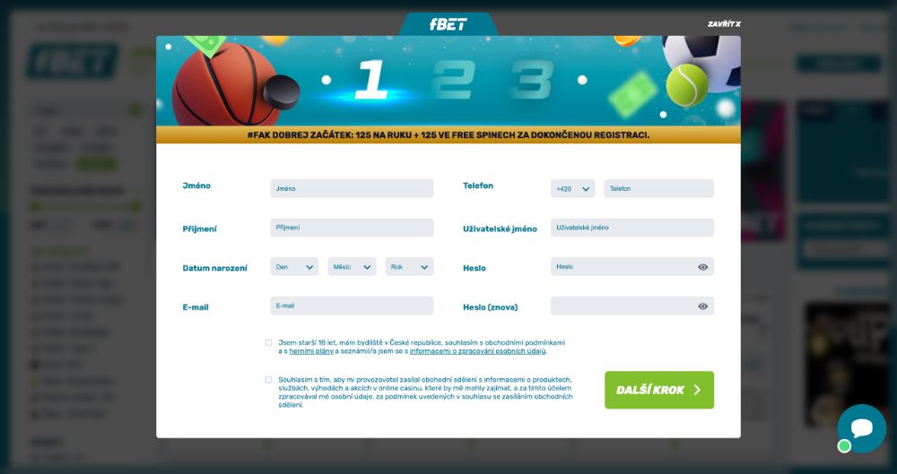 Navštivte oficiální webové stránky casina fBET, kde vás přivítá moderní, přehledné a uživatelsky přívětivé rozhraní. Pro zahájení registrace klikněte na zlaté tlačítko „REGISTRACE“, které najdete v pravém horním rohu stránky. Následně se zobrazí registrační formulář, ve kterém: