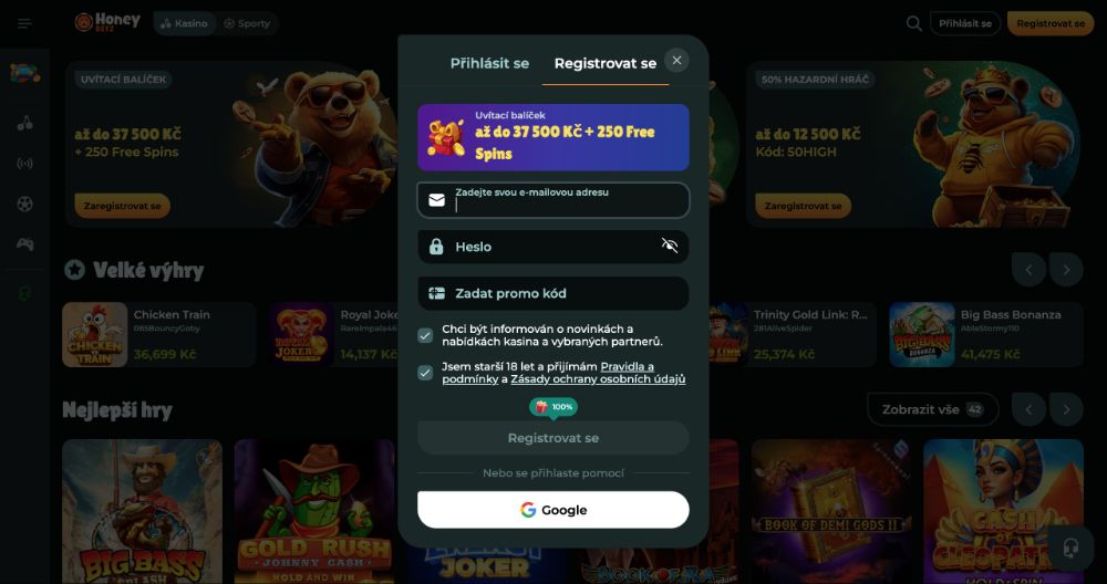 Vyrazit za uvítacím balíčkem až 37 500 Kč a 250 free spinů a přitom neztrácet čas složitou registrací? HoneyBetz to má nastavené tak, aby byl začátek rychlý a srozumitelný.