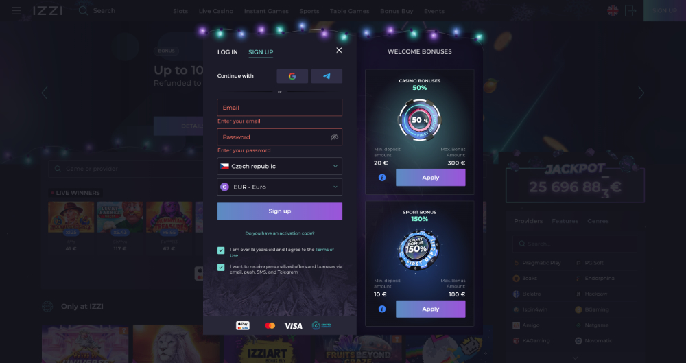 Po příchodu na úvodní stránku casina Izzi kliknete v pravém horním rohu na Sign Up. Otevře se registrační formulář, kde vyplníte e-mail a heslo. Pomocí ikonky oka si můžete heslo zobrazit a zkontrolovat, že je zadané správně. Země je obvykle předvyplněná automaticky, následně si vyberete měnu účtu, nejčastěji euro nebo kryptoměnu. Během registrace narazíte také na možnost zadat aktivační kód. Pokud žádný nemáte, registrace proběhne i bez něj. U pole je informační ikonka, kde si můžete ověřit, k čemu kód slouží.
