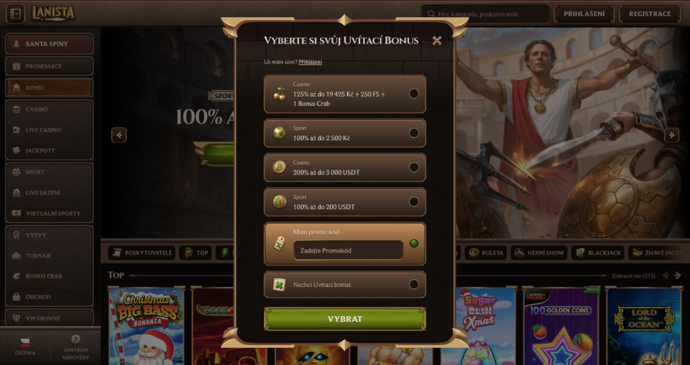 Promo kód má nejčastěji podobu slova či kombinaci slova a čísla. Zadáván bývá během provádění vkladů a poskytne vám skvělé bonusy. V casinu Lanista ale nejsou promo kódy k zisku bonusů potřeba. Lanista je během provádění vkladů nevyužívá. Existuje však jedna výjimka, a tou je uvítací nabídka. Vybíráte si ji na začátku registrace z těchto možností: