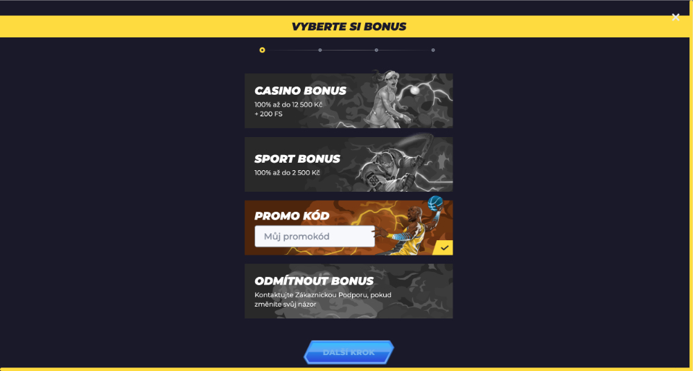 Po registraci a prvním vkladu v reálných penězích mohou noví hráči získat 100% bonus až do 12 500 Kč a k tomu 200 zatočení zdarma. Pro zapojení do nabídky je nutné vložit alespoň 500 Kč, přičemž free spiny jsou rozděleny do denních dávek po 20 a připisují se po dobu 10 dnů, vždy s platností 24 hodin.