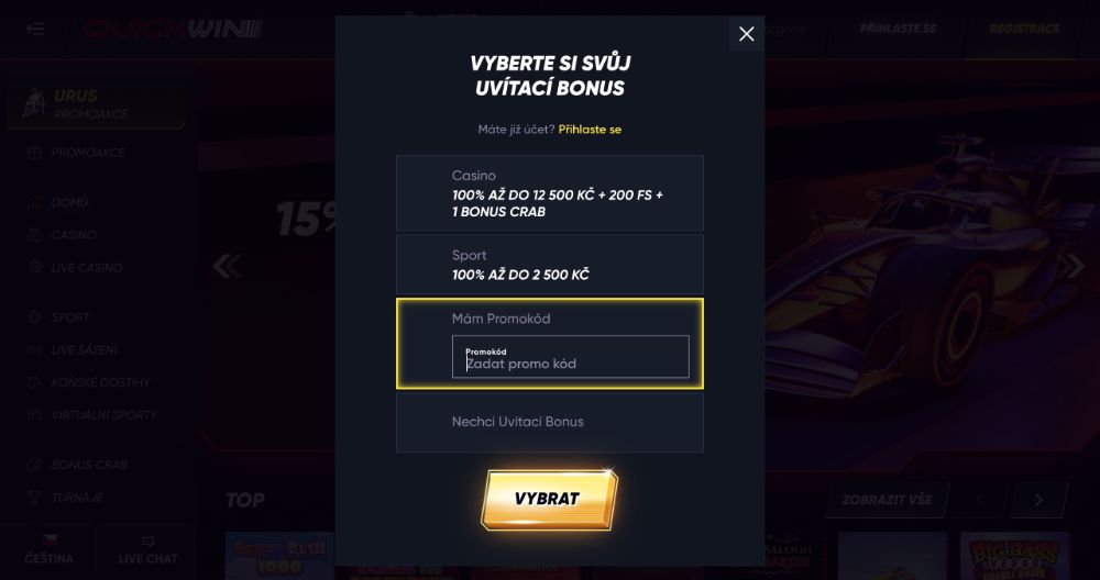 Na platformě QuickWin má každý nový uživatel možnost vybrat si hned při registraci typ bonusu. Platforma nabízí dvě odlišné varianty – uvítací casino bonus a uvítací sportovní bonus. Oba jsou dostupné přímo v sekci „Promoakce“ a nejsou vázané na žádný promo kód. Stačí si vybrat, aktivovat nabídku ve svém profilu a dodržet jednoduché podmínky. Tím získá hráč okamžitý start s výhodami, které může využít podle toho, jestli preferuje casino, nebo sportovní sázení. Níže máte přehled obou uvítacích bonusů v jasné a rychlé podobě.