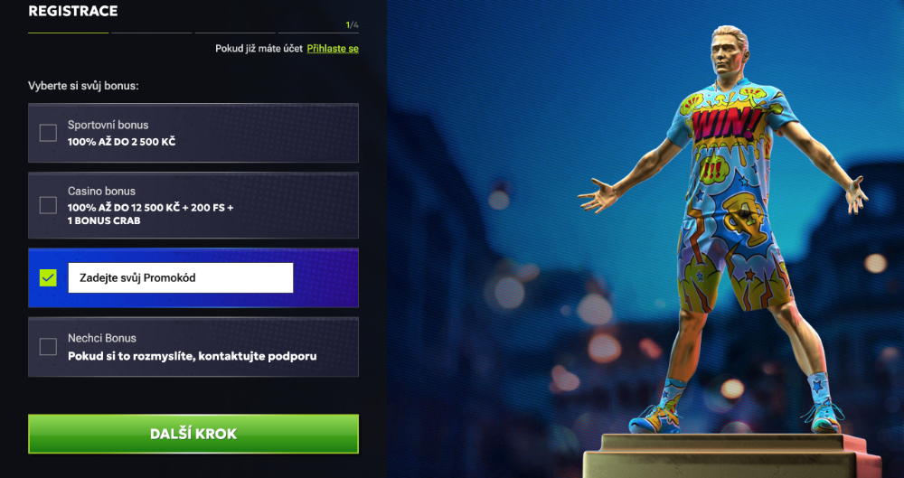 Máte-li promo kód, tak zvolíte možnost „Mám promokód“ a kliknete na ni. Ihned se vám zobrazí kolonka, do níž promo kód napíšete. Je-li v pořádku, můžete pokračovat kliknutím na zelené tlačítko „Další krok“ a dokončit registraci. V případě, že jste zadali promo kód chybně, tak se vám o tom zobrazí pod kolonkou sdělení a nebude možné pokračovat v registraci. Promo kód tak můžete ihned opravit a následně se těšit na odměnu, kterou za něj obdržíte.