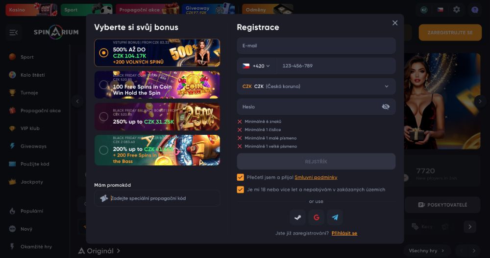 Promo kód lze v casinu Spinarium zadat již během registrace