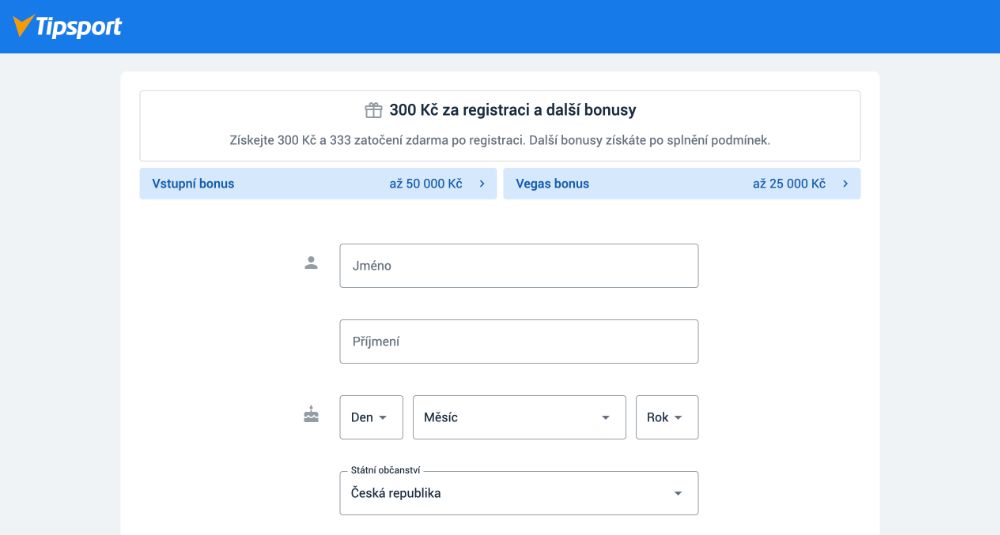 Registrace v Tipsportu začíná tím, že si zvolíte uvítací promo nabídku – Vstupní bonus nebo Vegas bonus. Teprve poté je vyžadováno, abyste vyplnili své základní osobní a kontaktní údaje. Nejprve je nutné do příslušných polí vepsat celé jméno a příjmení, přesné datum narození, telefonní číslo a e-mailovou adresu. Nakonec ještě zatrhnete souhlas s registrací a porozuměním všech podmínek a pravidel a můžete pokračovat dále.