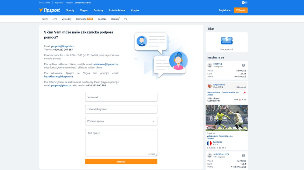 Kontaktujte zákaznickou podporu na e-mailu podpora@tipsport.cz.