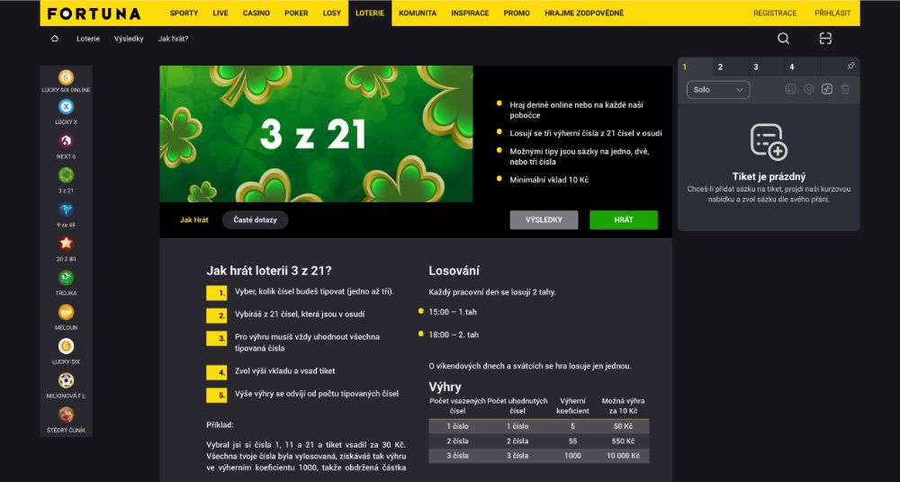 Hrát můžete online na stránkách Fortuny, kde probíhá registrace i vyhodnocení automaticky, nebo na pobočkách po celé republice.Na pobočce nemusíte být registrováni u společnosti Fortuna. Loterie 3 z 21 je dokonalou volbou pro ty, kdo hledají krátkou, napínavou a férovou hru s okamžitým výsledkem.
