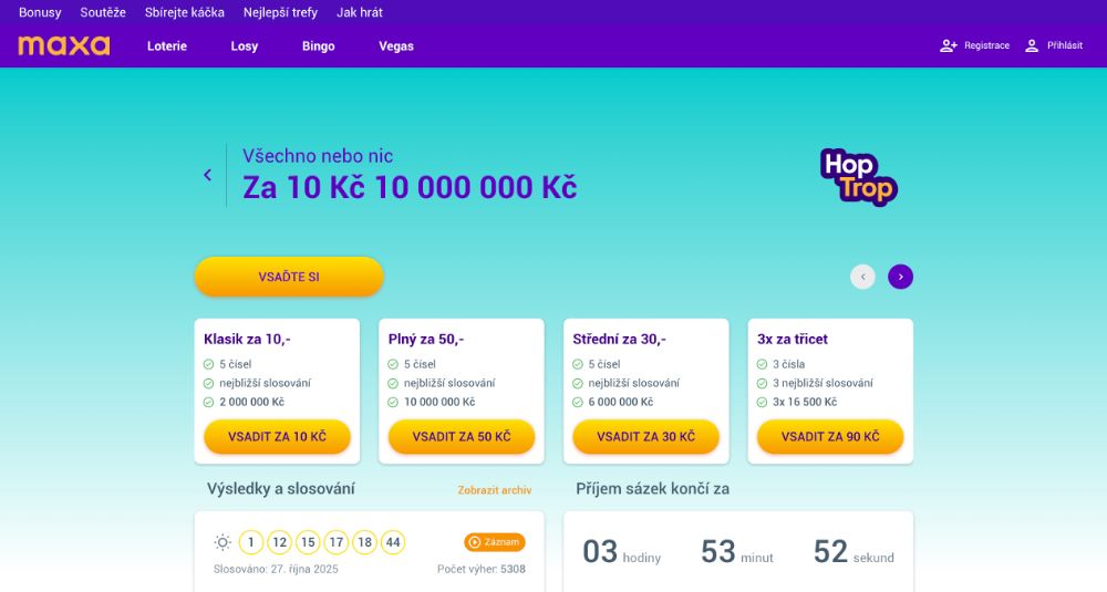 Loterie Maxa Hop Trop nabízí hráčům jednoduchou, ale vzrušující cestu k výhrám, které mohou dosáhnout až 10 milionů korun. Stačí si vybrat svá šťastná čísla, vsadit malou částku, a pak čekat na slosování. Sázky začínají již od 10 Kč, což dělá tuto hru přístupnou pro širokou veřejnost, a přitom vám dává šanci na opravdu vysoké výhry. Tento formát loterie nabízí nejen snadná pravidla, ale i širokou škálu možností, jak si přizpůsobit hru podle svých preferencí.