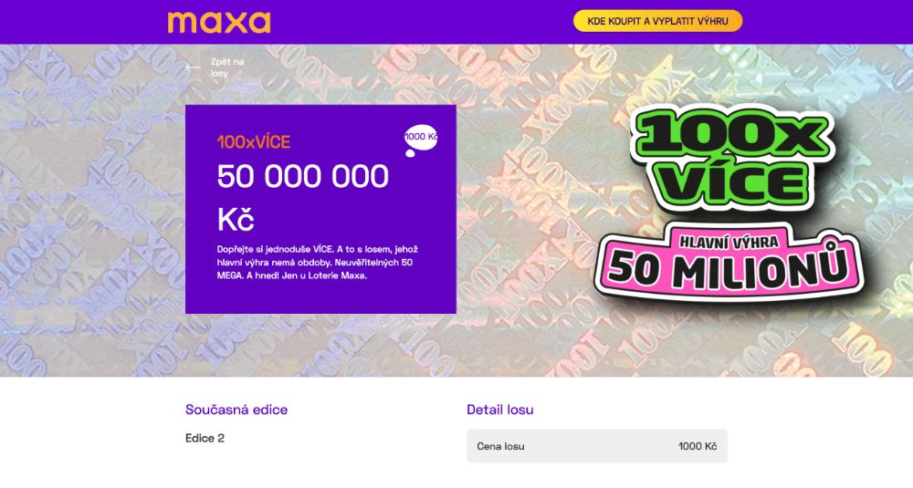 100x Více Edice 2 je nová okamžitá loterie od společnosti Loterie Maxa, která dává hráčům šanci na okamžitou peněžní výhru po setření hracího pole. Loterie probíhá podle zákona o hazardních hrách a navazuje na oblíbený formát stíracích losů s vysokými výhrami.