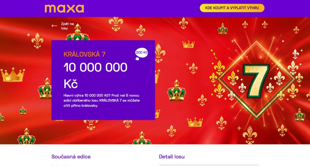 Prémiový stírací los Královská 7 od společnosti Loterie Maxa přináší hráčům šanci cítit se opravdu královsky, a to s hlavní výhrou až 10 milionů korun.
