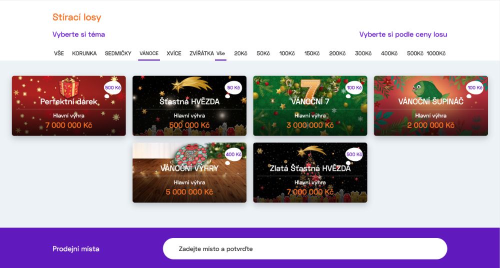 Vánoční 7 (cena 100 Kč, hlavní výhra 3 000 000 Kč): Tentokrát jsou tu dvě herní pole. V prvním je 5 výherních čísel a 20 vašich čísel, jde o přímé porovnání. V tom druhém jsou 2 herní symboly, pokud jsou totožné, může se výherce těšit na částku, která je zde uvedená.