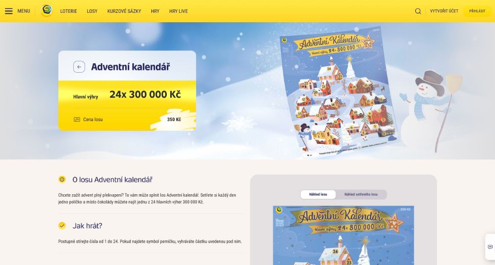 Vánoce se pomalu blíží a Sazka si pro své hráče připravila opravdu kouzelný los. Adventní kalendář spojuje radost z očekávání s překvapením, které může být sladší než jakákoli čokoláda. Každé z 24 políček skrývá šanci na výhru, přičemž hlavních cen je hned 24 a každá má hodnotu 300 000 Kč. Tento los je skvělou alternativou klasického adventního kalendáře. Každý den si setřete jedno políčko a místo bonbonu může přijít pěkné překvapení v podobě peněžní výhry. Tak co, vydržíte stírat každý den jen jedno políčko, nebo neodoláte, a půjdete do všech hned?