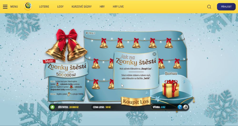 Malé Zvonky štěstí jsou kouzelným online losem, který přináší radost a napětí přímo do vaší aplikace. S celkovým počtem 600 000 losů, z nichž je 162 208 výherních, máte šanci na skutečné překvapení. Výhra je vaše ve chvíli, kdy aplikace odhalí výsledek. Prodej losů běží až do 19. června 2027, nebo do 19. června 2028, pokud bude platit nadále základní povolení. Hraní tohoto losu je snadné a intuitivní. Los se skládá ze dvou částí – Hry 1 a Bonusu.