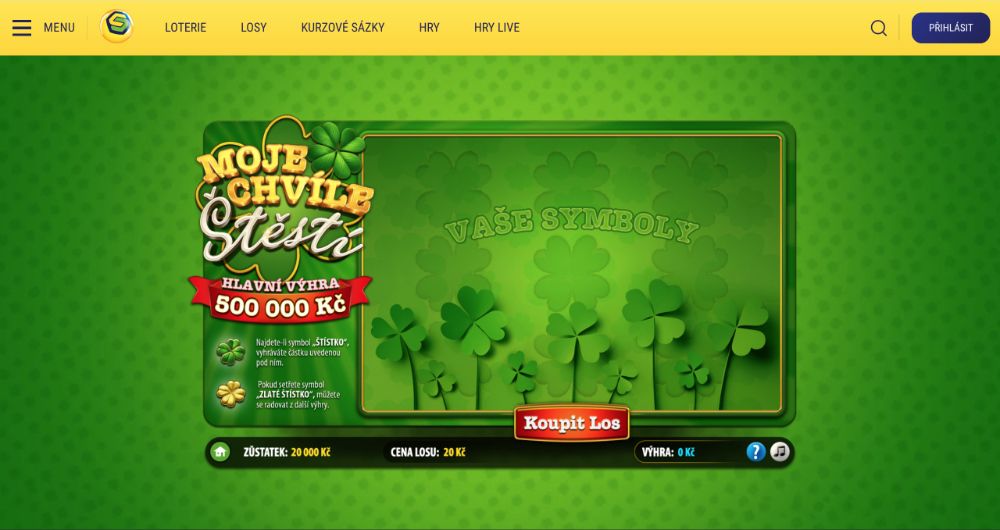 Moje chvíle štěstí je jednoduchý online stírací los s devíti herními poli, pod kterými se ukrývají peněžní částky a speciální symboly. Hlavní výhra může dosáhnout až 500 000 Kč. Stačí setřít všechna pole a objevit symbol Štístko pro výhru uvedené částky, nebo Zlaté Štístko, které přináší všechny částky z losu najednou. Za pouhých 20 Kč si můžete dopřát rychlou, jednoduchou a zábavnou hru, která dokáže překvapit i malou dávkou velkého štěstí.