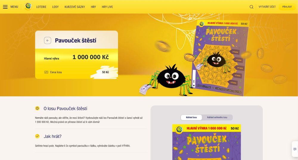 Nemáte rádi pavouky, ale věříte, že nosí štěstí? Možná právě teď přišel čas změnit názor. Los Pavouček štěstí dává hráčům možnost vyhrát až 1 000 000 Kč – a navíc přináší trochu herní symboliky. Pavouček tu představuje nejen výhru, ale i přívětivého nositele štěstí, který může změnit běžný den ve výjimečný. Prodej losu Pavouček štěstí je naplánován do 30. června 2026 nebo do vyprodání zásob.