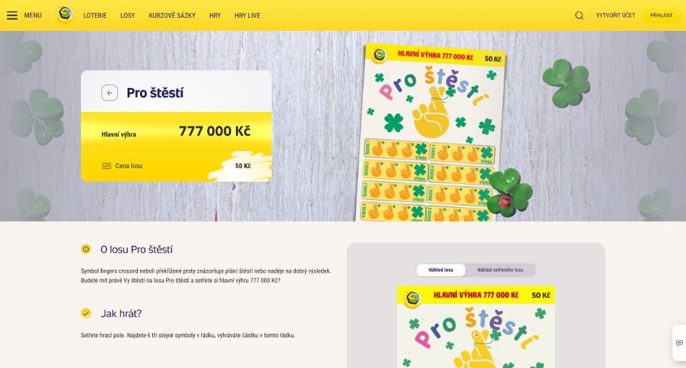 Stírací los Pro štěstí patří k těm, které si lidé kupují jen tak – pro radost. Jednoduchý princip, přátelská cena a zajímavé výhry z něj dělají stálici mezi stíracími losy Sazky. O tom, že štěstí přeje připraveným, se přesvědčíme v článku.
