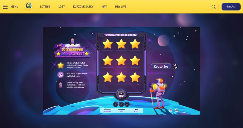 Online los Štědré hvězdy vás vezme na výlet do vesmíru. Získat můžete lákavé výhry. Stačí setřít 9 symbolů a zjistit, jaké překvapení na vás čeká. Vaše maximální výhry mohou dosáhnout výše 50 000 Kč. Zkuste své štěstí a kupte si tento online stírací los. My vám o něm nyní řekneme více.