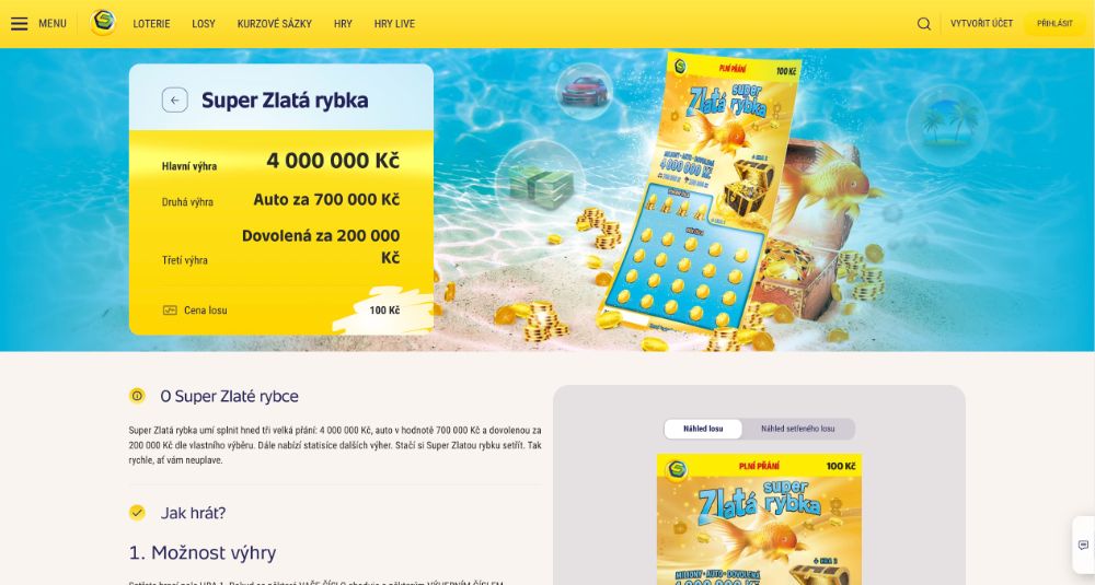Přemýšleli jste někdy, jaké by to bylo vyhrát 4 miliony korun, nové auto nebo luxusní dovolenou? Právě to nabízí Super Zlatá rybka, stírací los, který hráče láká na kombinaci jednoduchosti, okamžitého napětí a snu o životní výhře. Vyplatí se ho vyzkoušet? Jaké má šance na výhru a co všechno se skrývá pod stírací vrstvou?