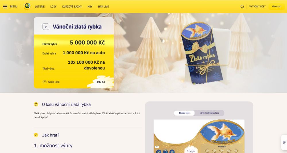 Toužíte po vánoční výhře, která by vám splnila vaše sny? Chcete vědět, jak funguje populární los Vánoční Zlatá rybka, jaké možnosti výher nabízí a jestli je možné ho hrát i online? Tento stírací los od Sazky kombinuje tradici, štěstí a zábavu dohromady – a vánoční motivy navozují příjemnou atmosféru plnou očekávání. Obsahuje tři různé hry, minimální výhru 200 Kč a hlavní výhru až 5 milionů korun.