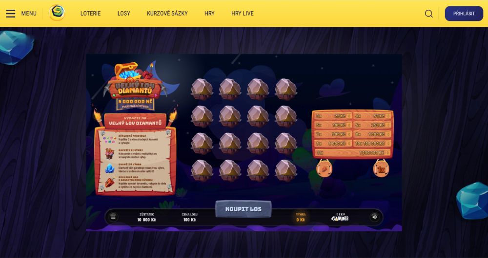 Online los Velký Lov diamantů působí jako animovaná výprava do podzemí, kde se pod vrstvou kamenů mohou ukrývat různé symboly a výhry. V levé části obrazovky je výrazné logo s maximální výhrou 5 000 000 Kč a přehled pravidel, která vysvětlují, že hráč hledá tři stejné kameny, multiplikátor nebo diamant pro okamžitou výhru. Součástí je také bonusová hra spuštěná symbolem dynamitu.