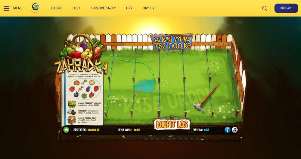 Přejděte do sekce losů, kde si spustíte los Zahrádka. Zahrát si můžete v demoverzi – to znamená, že nebudete potřebovat vlastní peníze k setření losu, avšak počítejte s tím, že skutečné peníze nemůžete vyhrát. Pokud si chcete zahrát „naostro“, musíte mít na svém herním účtu dostatek finančních prostředků. Máte? Tak postupujte následovně: